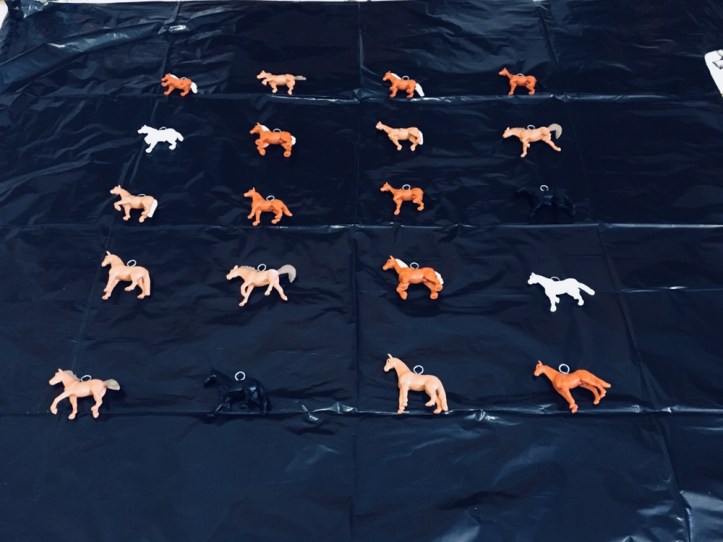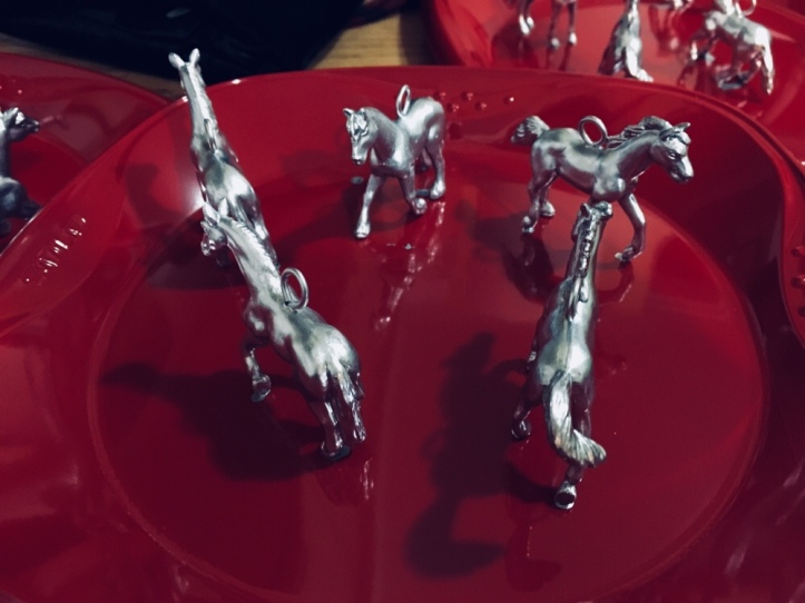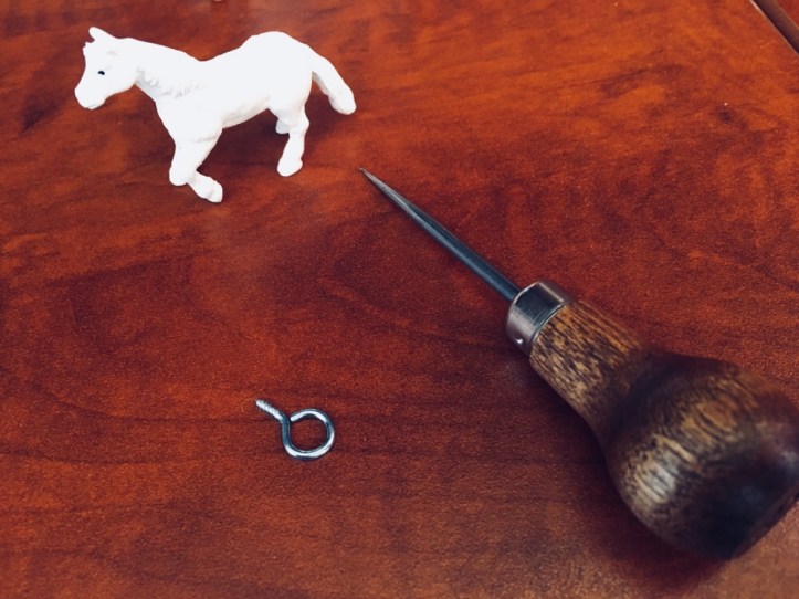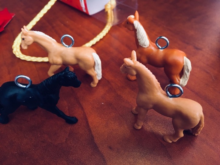 So I purchased miniature horse figurines at a craft store, alone with silver spray paint, little eyelet screws (like for the backs of picture frames) and little bows to tie around their necks.