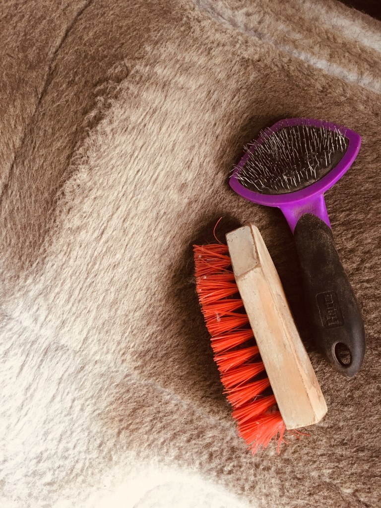 Environ une fois par semaine ou au besoin, avant de seller, je prends une brosse pour sous-poils et une brosse à sabot rigide sur mon tapis pour enlever les cheveux, la poussière et la sueur séchée. Assurez-vous que vous effectuez ce processus avant de commencer le lavage.