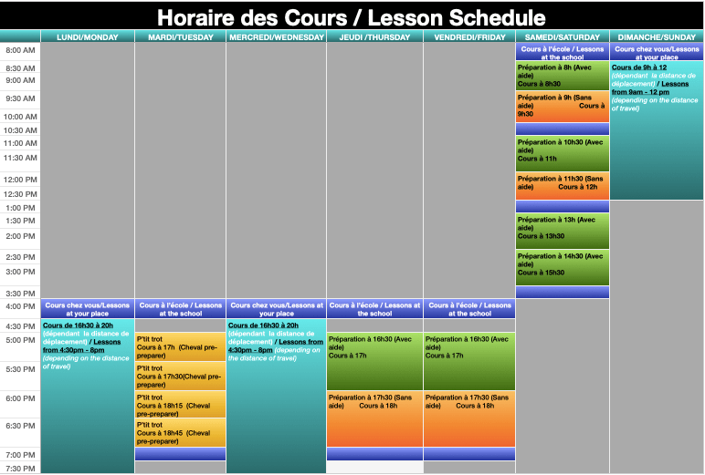 Le deuxième calendrier est pour mes étudiants sur place, qui comprend les mêmes informations que ci-dessus, sauf aucune adresse et j’ajoute lorsque le temps de préparation commence, car l’heure prévue est toujours le début de l’heure « arène ». Le troisième est pareil mais pour mes élèves hors de l’ecurie et le quatrième marque seulement les bloque de temps pour tous les cours de la journée confondus pour les pensionnaires.